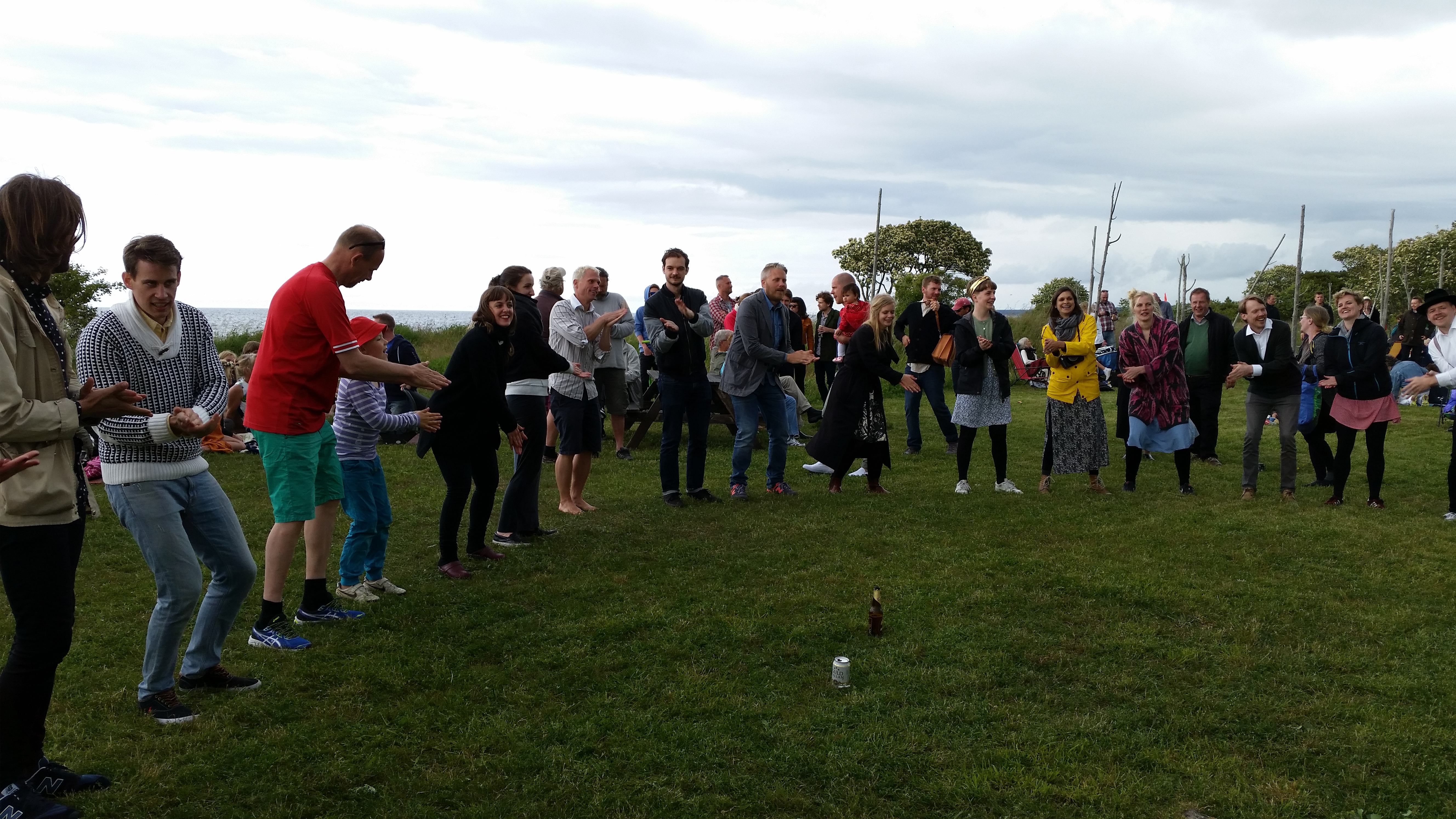 Så snart midsommarstången kommit på plats var det dags för ringlekar. Spelmännen Lars Ireblad, Jens Ringqvist och Leif Svensson spelade upp till dans och många både barn och vuxna tyckte det var ett bra tillfälle att värma upp sig med ”små grodorna” och andra traditionelle ringlekar. Säkert bidrog det lite kyliga vädret till att ringen kring stången blev så stor så att garngårdens bredd knappt räckte till för alla dansande.