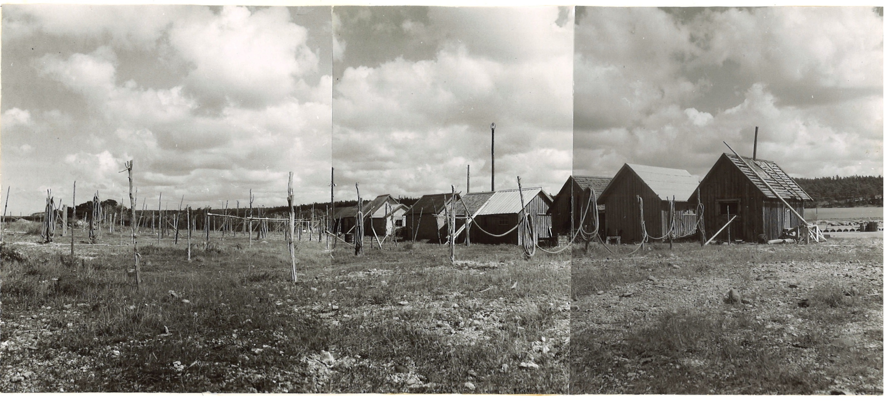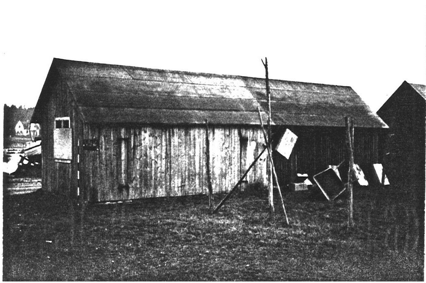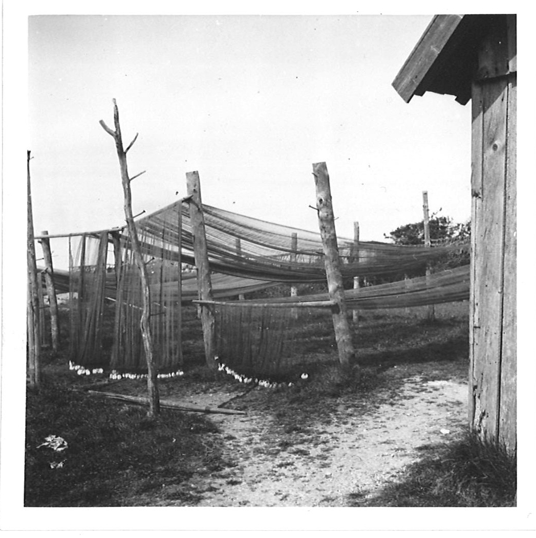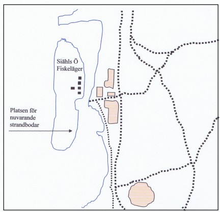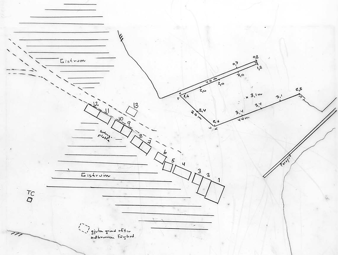 På skissen finns grunden markerad från en nedbrunnen litbod. Litboden användes för att färga näten. Den byggdes 1950. Toaletten, märkt med TC på skissen byggdes 1966.