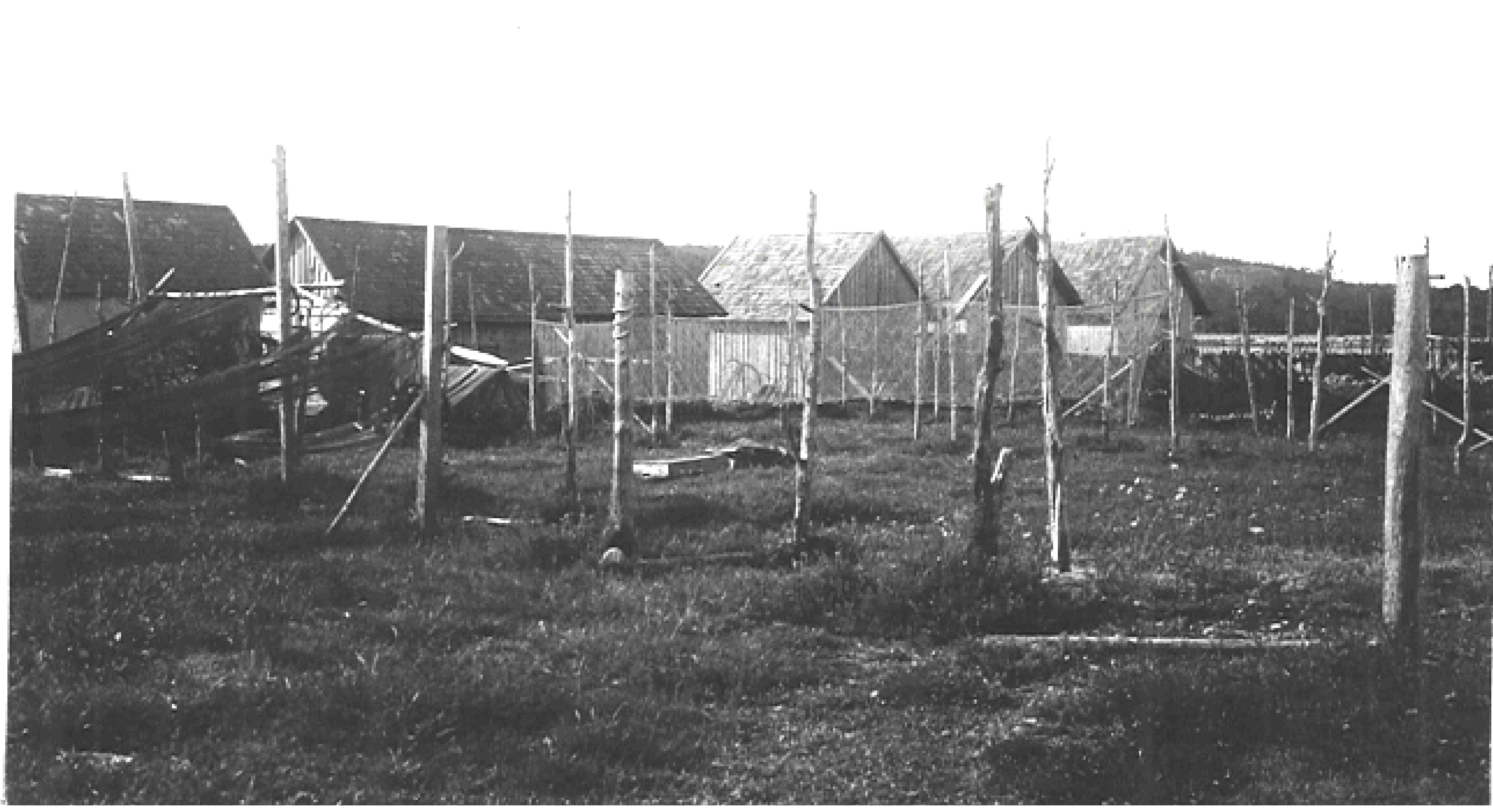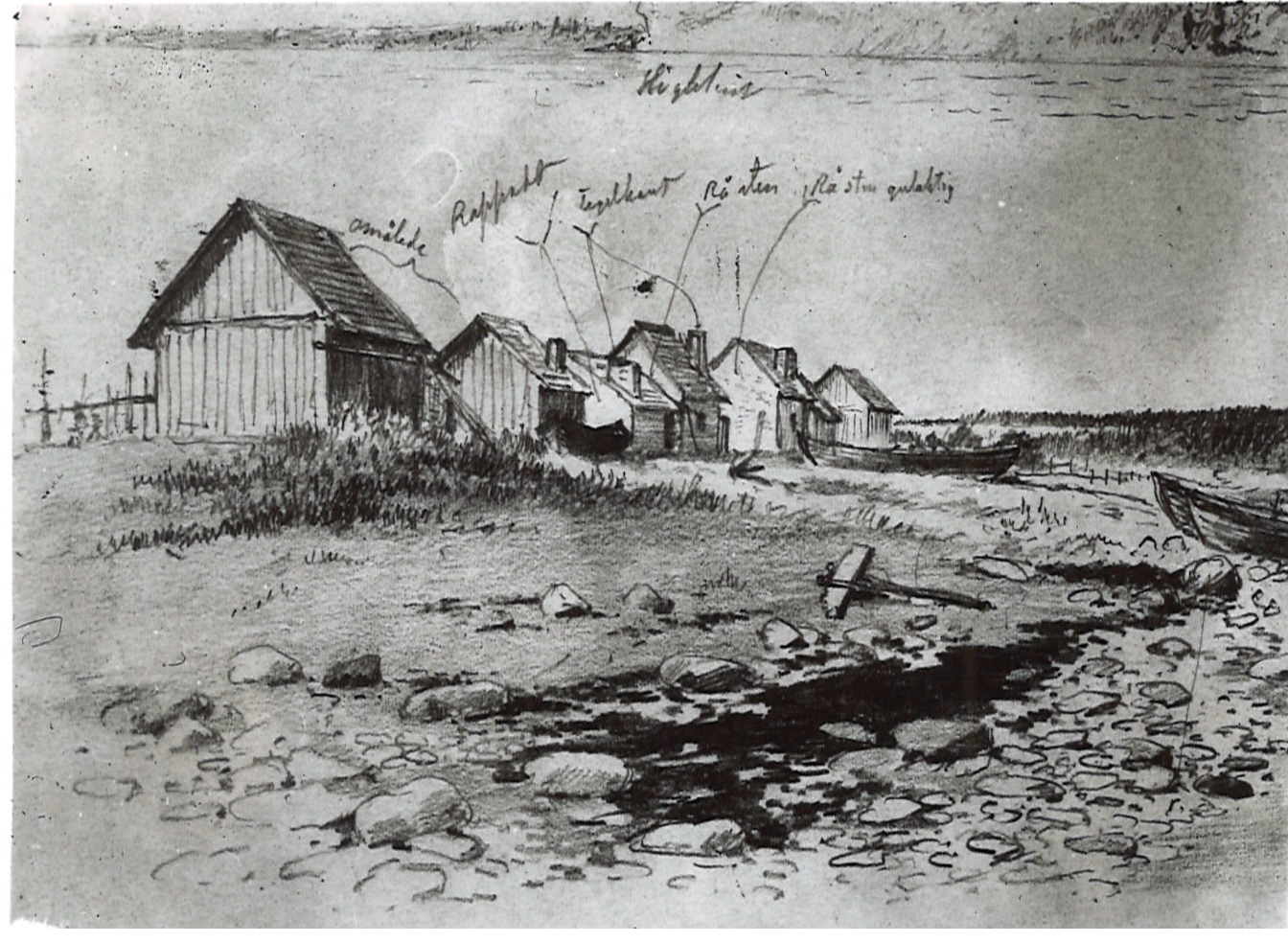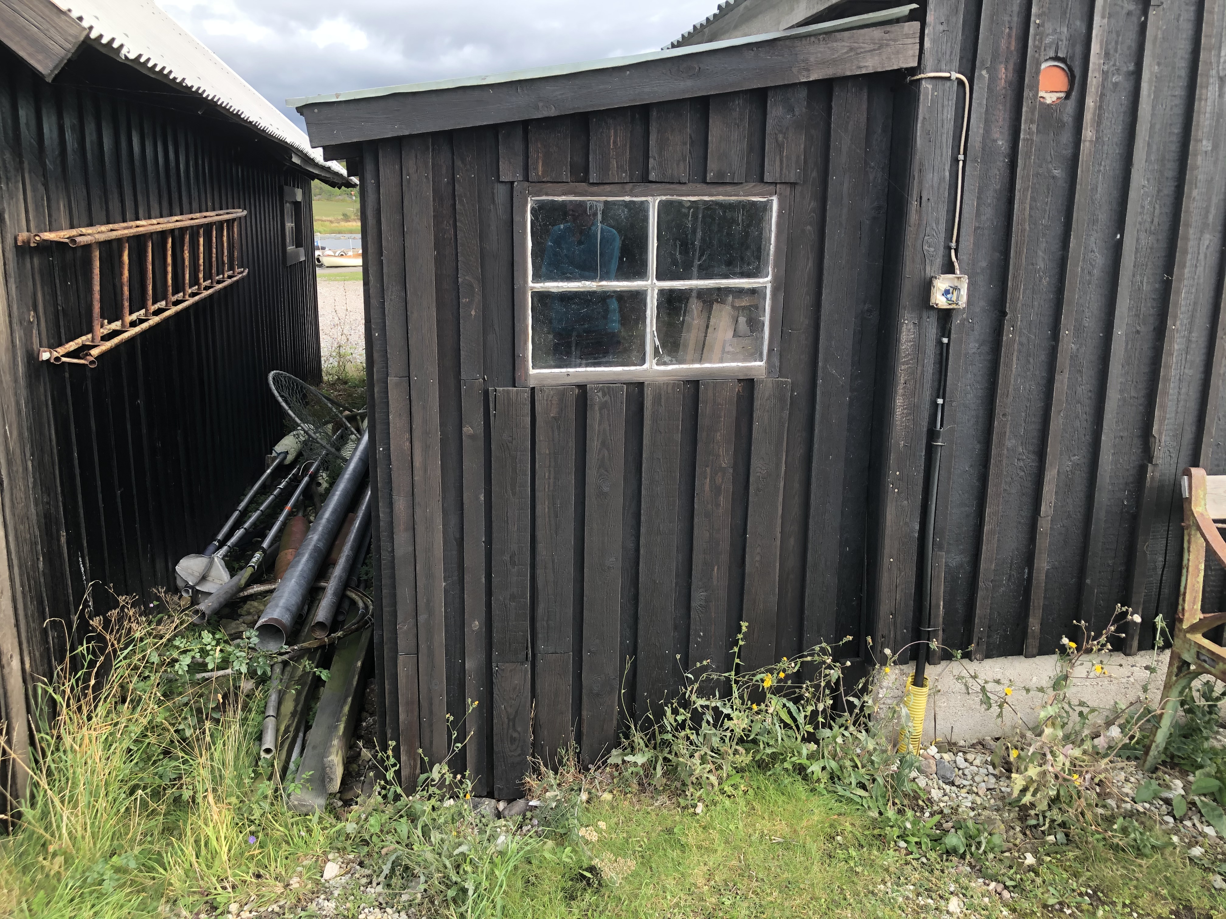 På skissen finns grunden markerad från en nedbrunnen litbod. Litboden användes för att färga näten. Den byggdes 1950. Toaletten, märkt med TC på skissen byggdes 1966.