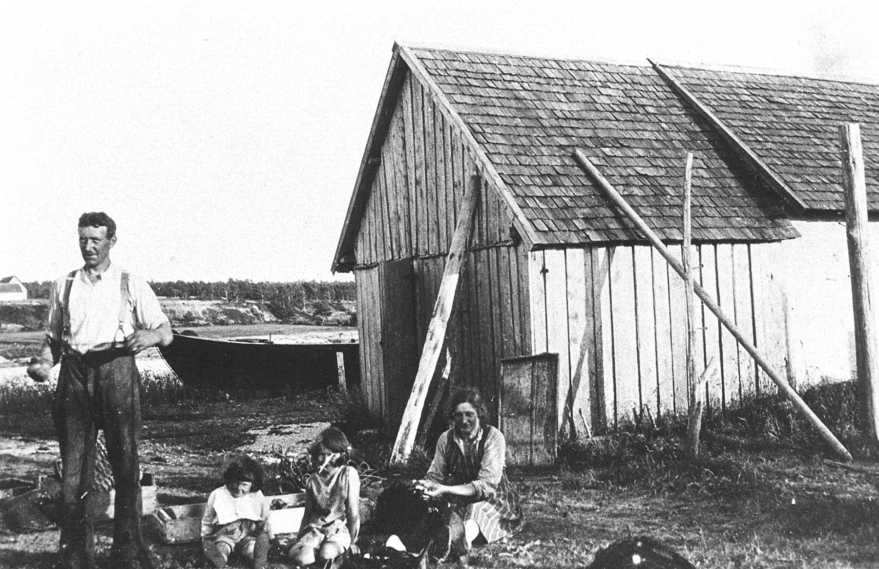 Boden finns med på ett foto från 1891 och har då faltak, saknar fönster samt har en dörr på gaveln. Fasaden är lägre än den intilliggande boden nr 9, men båda bodarna har samma höjd på takåsarna. Bodens längd var omkring 3,25 meter och alltså kortare än nuvarande bod. På bilden ovan, taget från stora garngården, är faltaket utbytt mot spåntak, men den låga fasaden finns fortfarande kvar liksom dörren. Det är ägaren och fiskaren Charles Pettersson, hans hustru Hulda och barnen Jack och Bibi (Birgit) som är med på fotot. Läs mer om Charles och hans sparrisodlingar under Historik- Skälsö 1940-tal.